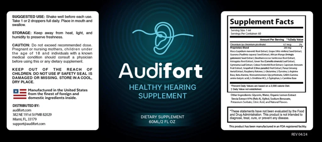 Manufactured in an FDA-approved facility that follows strict quality and hygiene protocols, Audifort supplement offers users a clean and reliable option for ear care. The supplement is conveniently available in liquid drop form, with each 60 ml bottle providing a month’s supply. It is suitable for both men and women aged 18 and older.